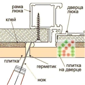 При розрізі лезо повинно упиратися кінчиком в гипсоволокно. В іншому випадку ви не зможете прорізати силікон на всю глибину. А це, в свою чергу, загрожує відривом затирання при спробі відкрити дверцята. Або доведеться різати повторно, через що на силіконі обов'язково з'являться "задираки". Якщо всі пункти виконати в точності, як написано, то виконаний розріз на межплиточном шві буде невидимий для непосвячених. Торці плиток на стіні дуже бажано очистити від залишків силікону, в іншому випадку, при закриванні дверцята, вона буде "прилипати". Якщо утворилися надлишки силікону, що заважають нормальній роботі люка, то їх можна зняти абразивної сіткою або шкіркою. Бажаємо успіхів!